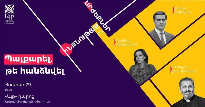 Հունիսի 29-ին՝ ժամը 18:30-ին, հրավիրում ենք բոլորին «Այբ» դպրոց՝ մասնակցելու «Ինքնություն և արժեքներ» շարքի նոր հանդիպմանը։ Հանդիպման թեման՝ պայքարել, թե հանձնվել: