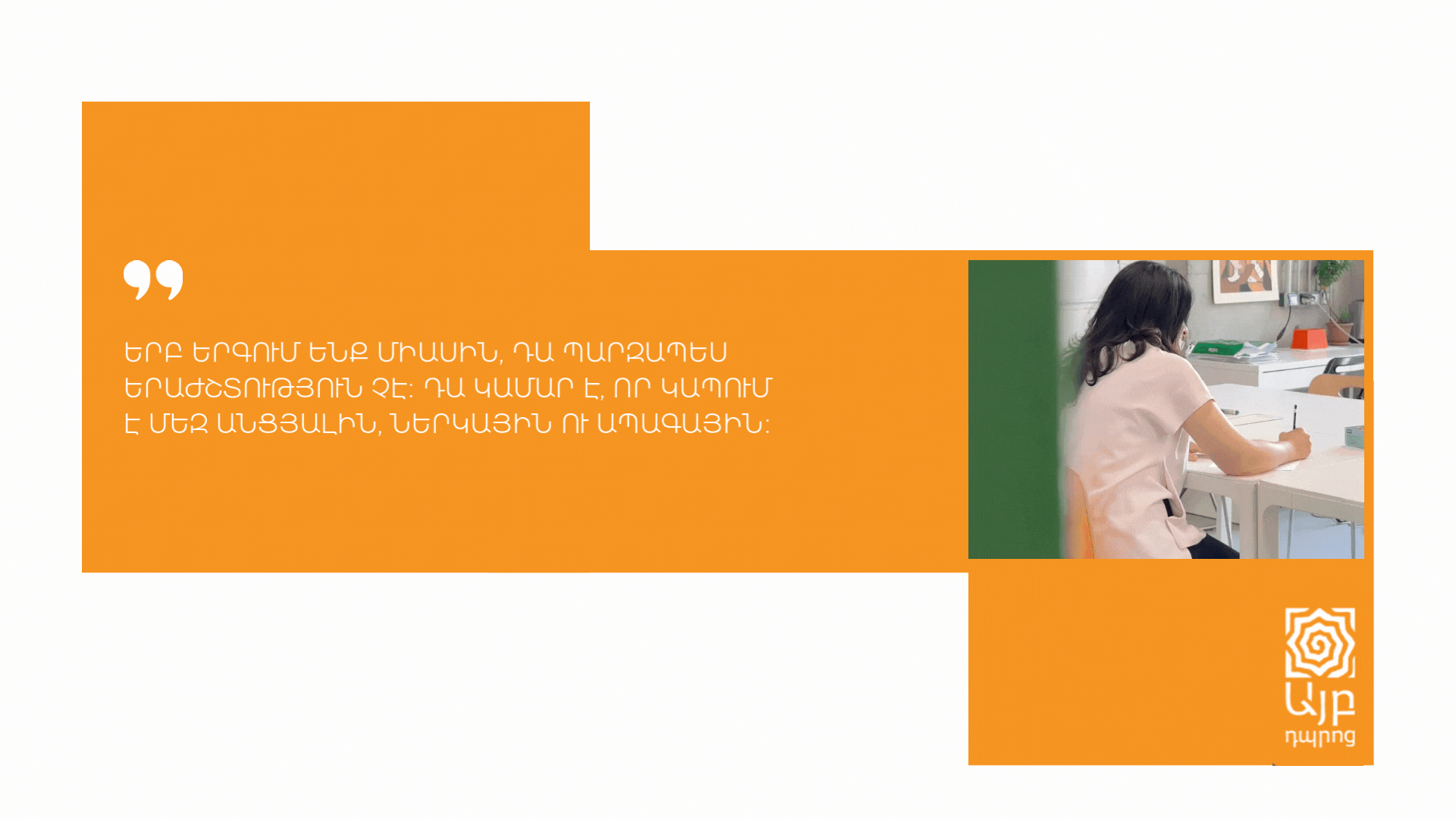 Երգը միշտ էլ եղել է հայի հոգևոր կյանքի հիմքում։ Այն մխիթարություն է, ուրախություն, նաև ինքնության ճանաչման ուղի։ «Այբ» դպրոցի համար երգը դարձել է մի ամբողջ աշխարհ՝ հարթակ, որտեղ հանդիպում են սերունդները, որտեղ դպրոցականներն ու շրջանավարտները միասին շարունակում են ազգային երաժշտության ճանապարհը։
